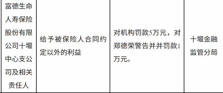 11月14日,国家金融监督管理总局十堰监管分局行政处罚信息公开表显示,富德生命人寿保险股份有限公司十堰中心支公司及相关责任人因给予被保险人合同约定以外的利益被罚款5万元,郑某荣警告并并罚款1万元。